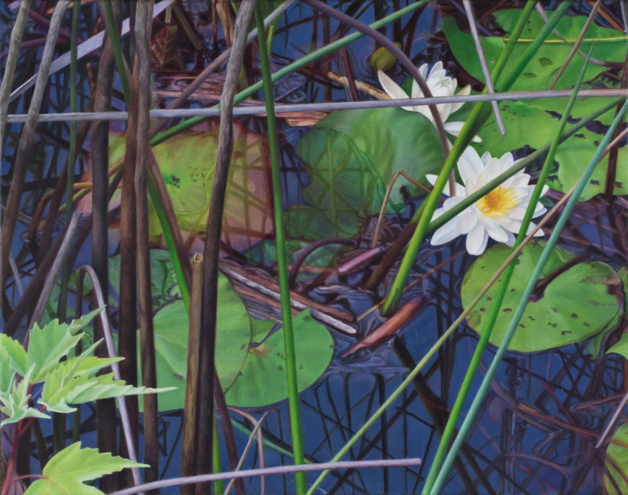 My work depicts transformations in the Southern garden and landscape. A variety of factors including specific features, shapes, color variations or contrasts in lights and darks can influence my decision to paint a particular image. However, once engaged in the painting process, I pay as much attention to the deepest space or what is under the surface of the water as I do to a brilliantly lit leaf or a translucent bloom. The initial attraction gives way to the process of looking intently and painting the colors, shapes, light, patterns, complexities and abstractions that I find.