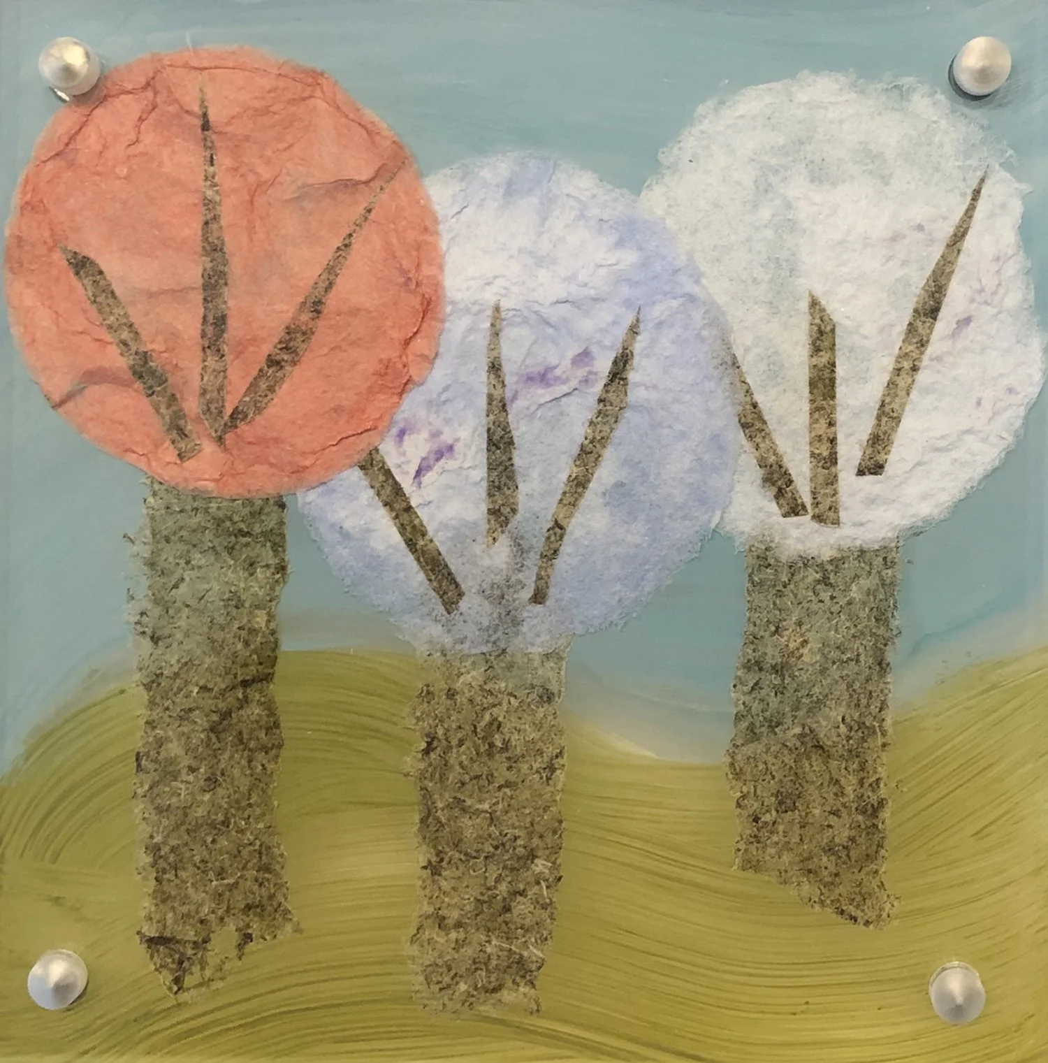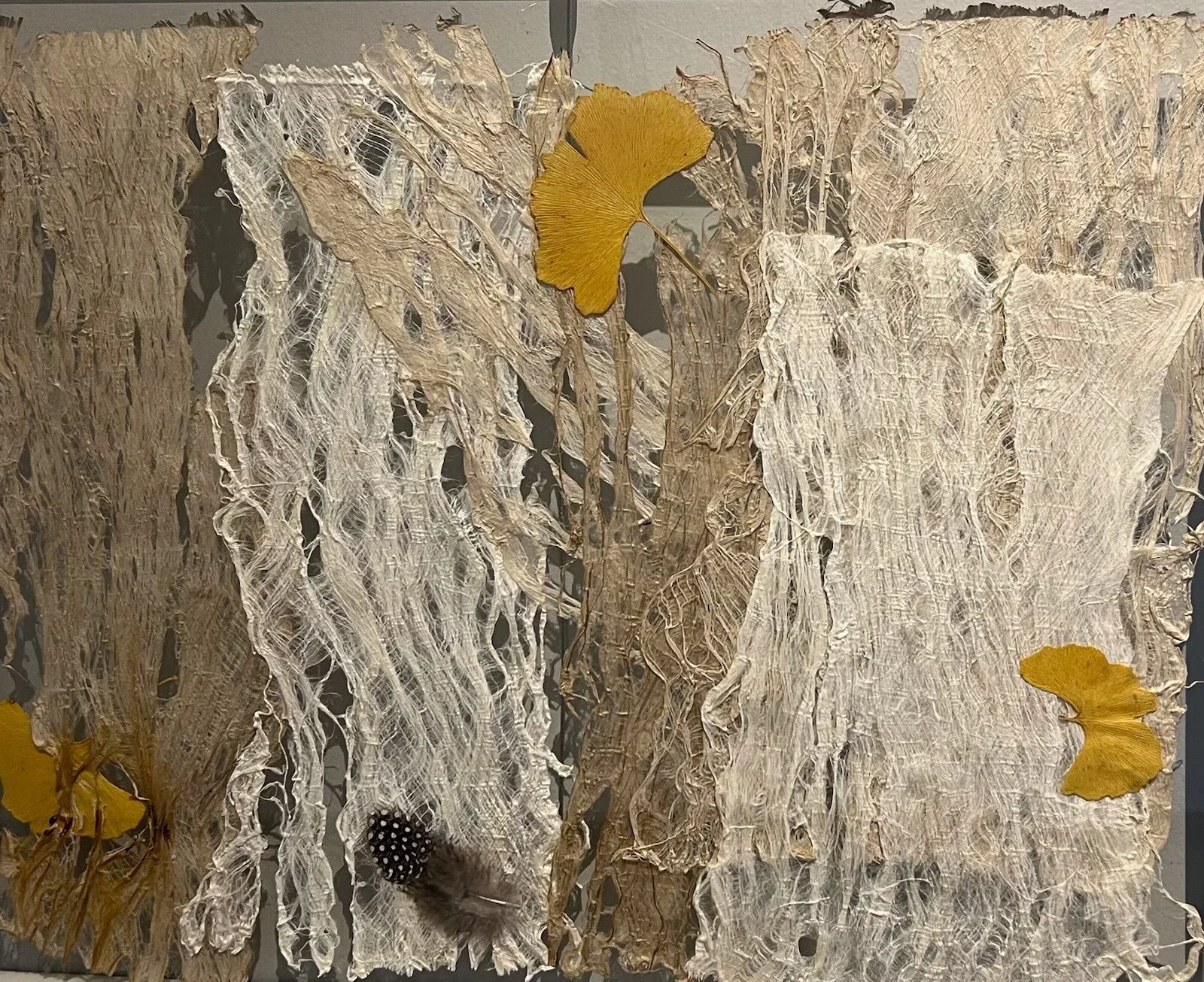 I work with handmade paper, mixed media, collage, and oil