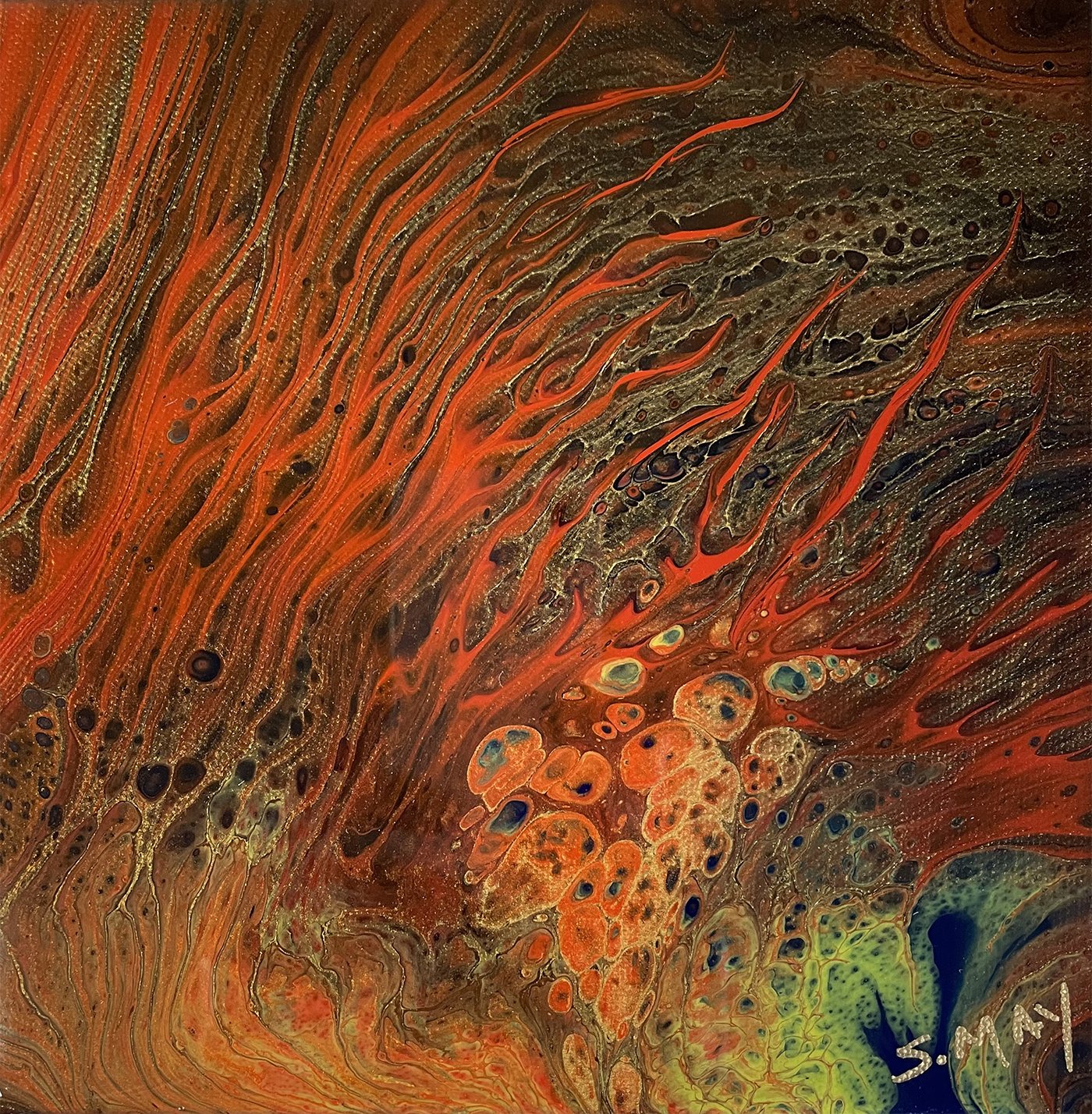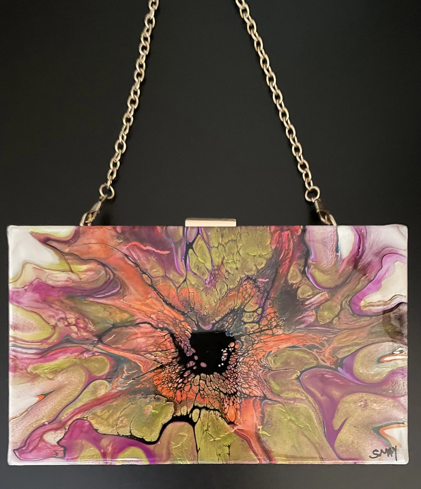 sherrymayart@gmail.comwww.sherrymayart.comI do acrylic fluid art. Everything is finished with resin. Here are some photos of my purses and wall art.