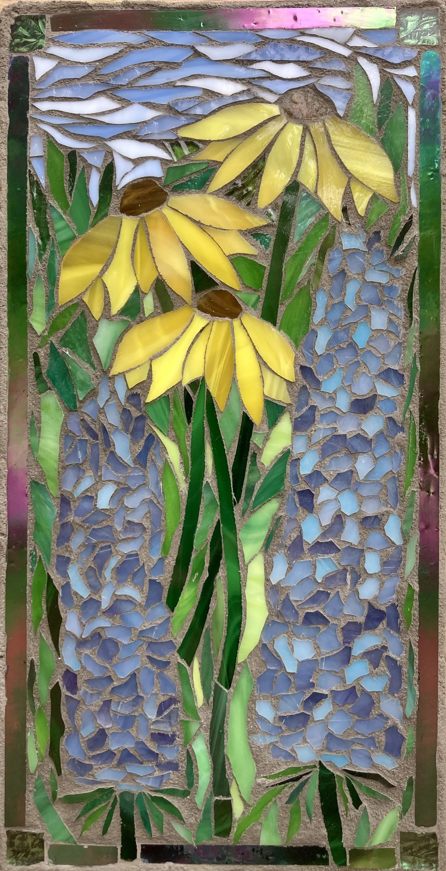 My mosaic art pieces tend to be very colorful and are influenced by Frank Lloyd Wright's art glass, the arts and crafts movement, and nature. I enjoy the challenge of finding detailed objects in nature, such as flowers and trees and figuring out how to recreate those objects in glass.